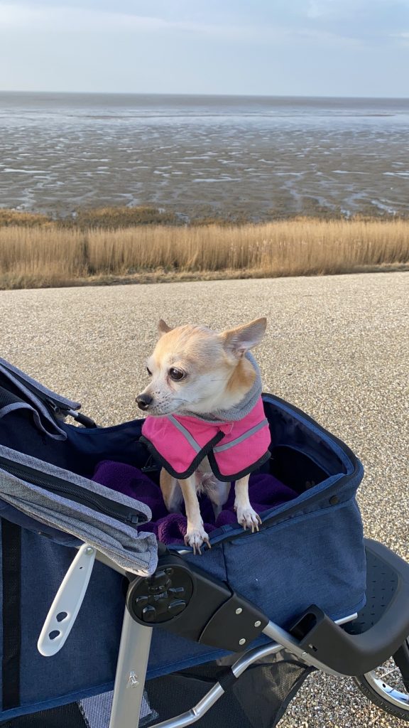 Hier sieht man auch wie elegant sie in Ihrem Wagen chauffiert wird. Der süße, rosa Mantel ist wichtig, da wir hier direkt auf dem Deich spazieren waren und es ganz schön windig war! Ohne den geht die Maus nicht länger als 30 Sekunden vor die Tür..